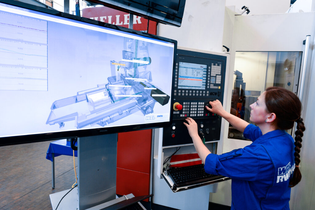 Eine Mitarbeiterin des Werkzeugmaschinenlabors WZL der RWTH Aachen University bedient in Aachen am Dienstag, 20.Juni 2017, eine Bohrmaschine.